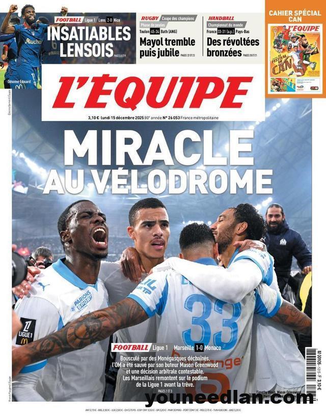 12月12日,25-26赛季法甲第16轮,格林伍德又一次刷新进球数,第82分钟接到赫伊别尔助攻冷静推射得分,攻入1-0致胜进球!