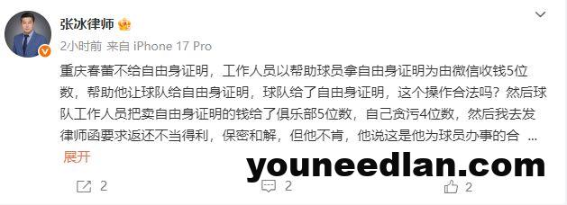 张冰透露,“重庆春蕾不给自由身证明,工作人员以帮助球员拿自由身证明为由微信收钱5位数,帮助他让球队给自由身证明,球队给了自由身证明,这个操作合法吗?然后球队工作人员把卖自由身证明的钱给了俱乐部5位数,自己贪污4位数,然后我去发律师函要求返还不当得利,保密和解,但他不肯,他说这是他为球员办事的合法收入,说要举报我,这个操作合法吗?”