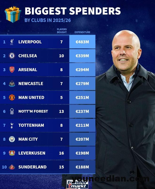 北京时间12月25日,在圣诞节之际,德转列出了世界足坛本赛季引援支出榜,利物浦以超4.8亿欧元高居第一,切尔西约3.4亿欧元第二,阿森纳约2.9亿欧元第三。