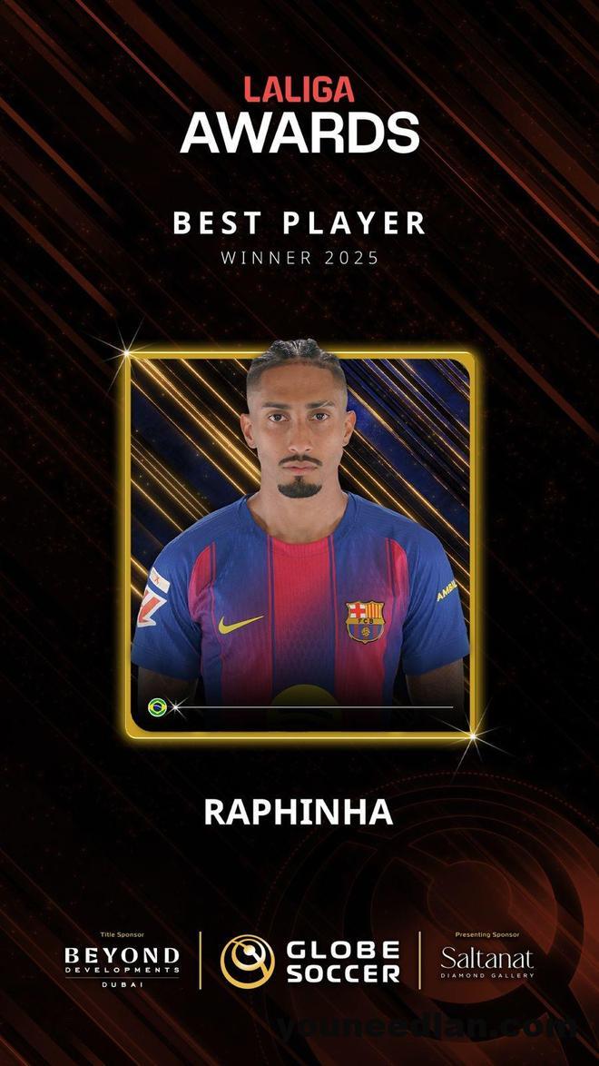 北京时间12月28日,2025年度环球足球奖颁奖典礼在迪拜举行,其中,拉菲尼亚获得了2025年度最佳西甲球员奖。