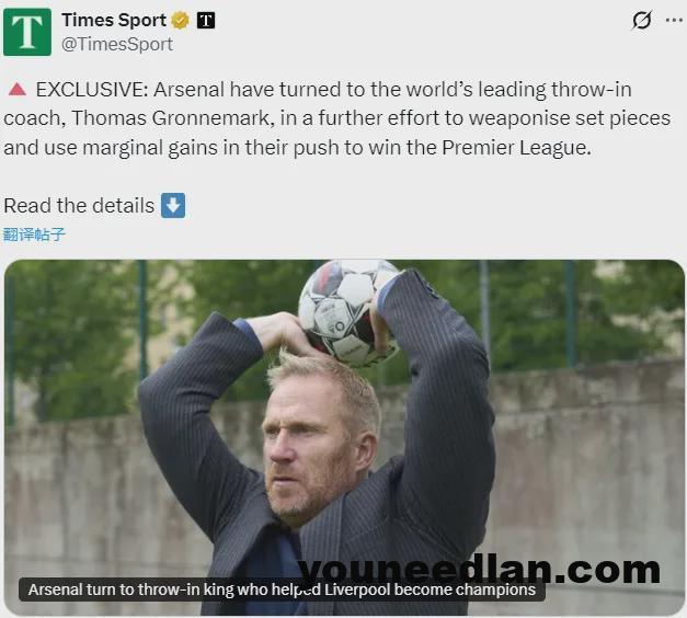 泰晤士报消息,世界顶尖的界外球教练托马斯-格罗内马克一直在以顾问的身份与阿森纳合作,他参观了枪手的训练场,并分享了自己的技术和知识,北伦敦豪门正进一步致力于把定位球战术打造成他们的制胜武器。