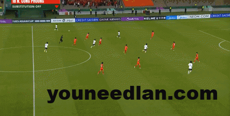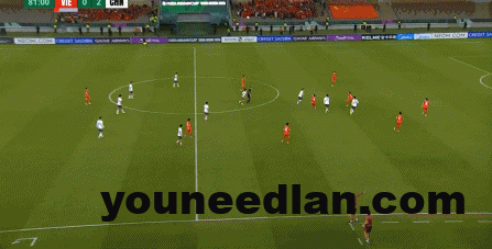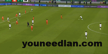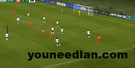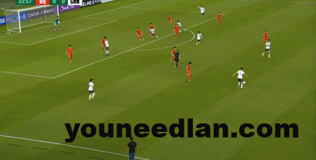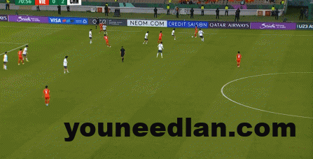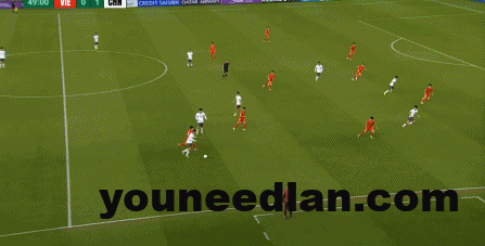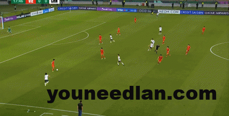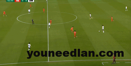 到了另外一边的二防二场景里,越南队进行换位,但右翼卫杨希在兼顾位置的同时,看准时机坚决前顶,便重新夺回了球权: