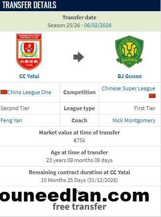 德转显示,长春亚泰中场王禹是自由转会至北京国安,此前他与长春亚泰还有一个赛季合同。