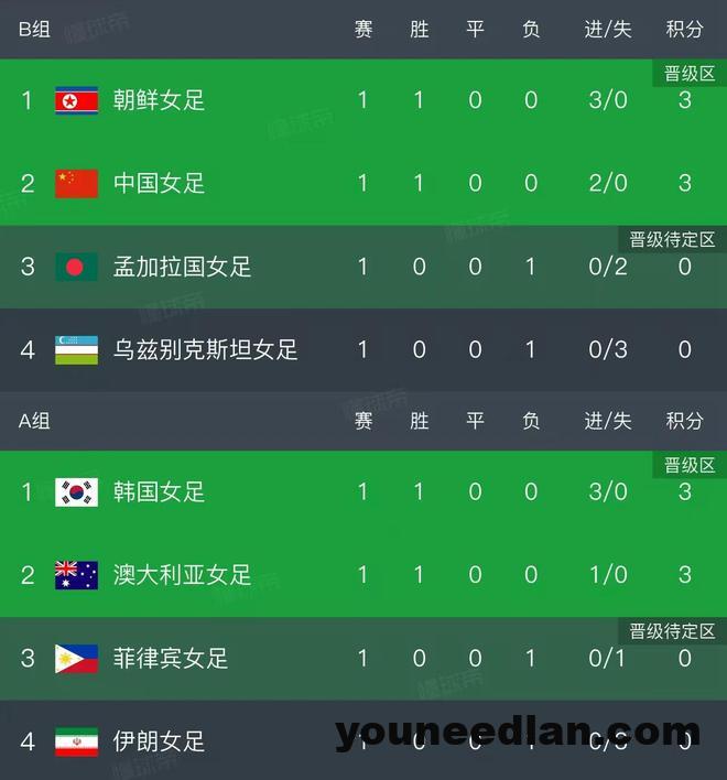 北京时间3月3日,女足亚洲杯小组赛第一轮继续进行,这个比赛日B组结束了两场比赛,我们一起看看最新积分榜的变动,卫冕冠军中国队2-0战胜孟加拉国,朝鲜队3-0完胜乌兹别克斯坦!