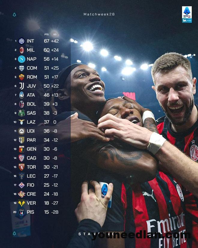 随着本轮最后一场比赛拉齐奥2比1击败萨索洛,意甲第28轮比赛全部结束。本轮联赛的重头戏自然是“米兰德比”二番战,AC米兰主场1比0小胜国米,完成了本赛季对同城对手的双杀,但国米仍然在积分榜上领先红黑军团7分;那不勒斯2比1取胜都灵,仍位居第三;罗马客场1比2负于热那亚,而本赛季“黑马”科莫2比1力克卡利亚里,与红狼军团同积51分,以净胜球优势反超竞争对手来到第四名,罗马跌至第五,尤文仍居第六,距离罗马1分。