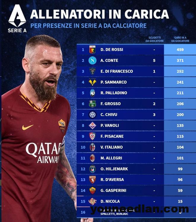 北京时间3月10日,德转统计出了意甲20家俱乐部现任主帅球员生涯的意甲出场数排名,热那亚主帅德罗西以459场排名第一,那不勒斯主帅孔蒂371场第二。