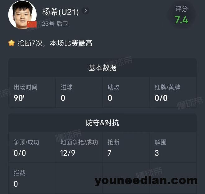 对阵库拉索的比赛,刘浩帆、杨希、徐彬、王钰栋4名此前随队参加U23亚洲杯的U23国脚代表国足首发出场,他们4人也作为首发球员参加U23亚洲杯决赛,其中杨希和徐彬也完成了他们在成年国家队的首秀。本场比赛杨希作为首发右后卫打满90分钟,完成全队最高的7次抢断、12次地面对抗成功9次以及3次解围的亮眼数据。库拉索作为归化大队,在进攻端相当依赖球员的个人发挥,杨希本场比赛完全遏制住了库拉索的左路进攻。用杨希自己的话来说:“在中超都防的是外援,早就熟悉了这种强度。”
