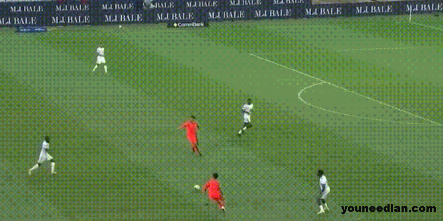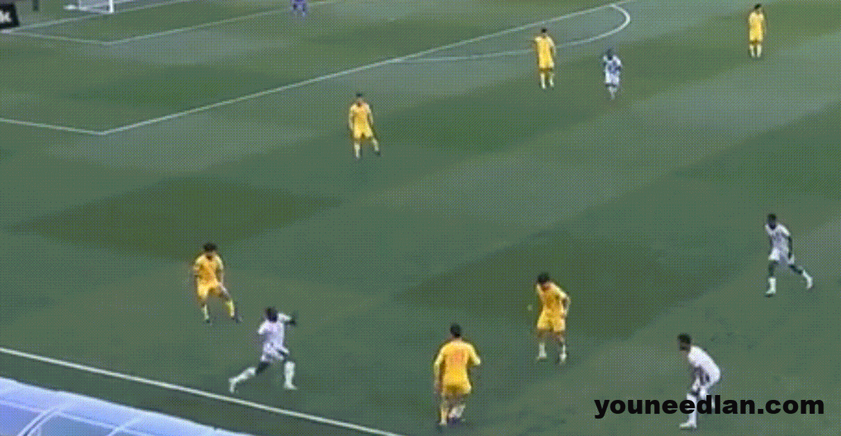 张玉宁本场比赛的状态实在太好,这次回撤之后轻巧地将球卸下,随后转身倚住后卫向前推进,在这个过程中他连续躲开了库拉索两名球员的放铲,只可惜最后向边路的分球出现了失误。