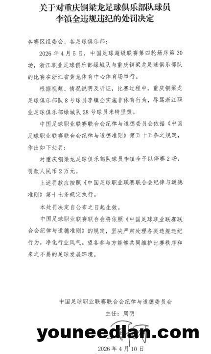 就在本场比赛前,重庆铜梁龙国脚李镇全,因为上轮中超辱骂浙江队外援米特里策,被中足联禁赛2场罚款2万元人民币。